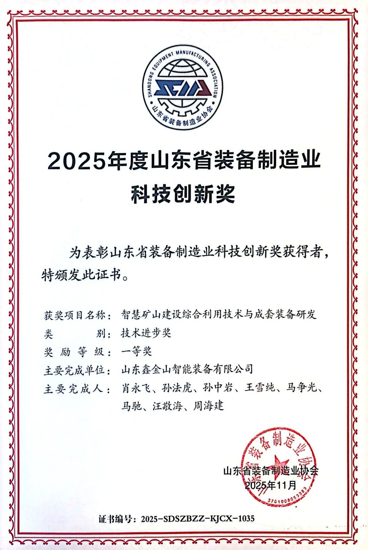 近日,山東省裝備制造業領域傳來重磅捷報 —— 由山東鑫金山智能裝備有限公司自主研發的 “智慧礦山建設綜合利用技術與成套裝備研發” 項目,在 2025 年度山東省裝備制造業科技創新獎評選中脫穎而出,榮膺一等獎!這一省級權威榮譽,是對鑫金山科技創新實力的高度認可。